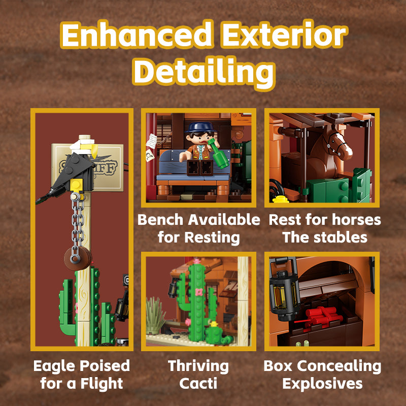 On the first floor, a bustling dining area welcomes outlaws and travelers alike. Upstairs, the entertainment lounge hides a web of intrigue. With its rustic styling and vibrant scenes, the saloon is a perfect storytelling piece or display centerpiece for Western fans and collectors.