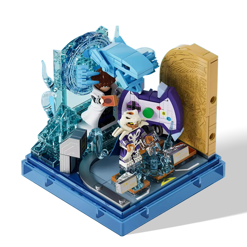 • Kaiba minifigure dons his signature white trench coat and duel disk