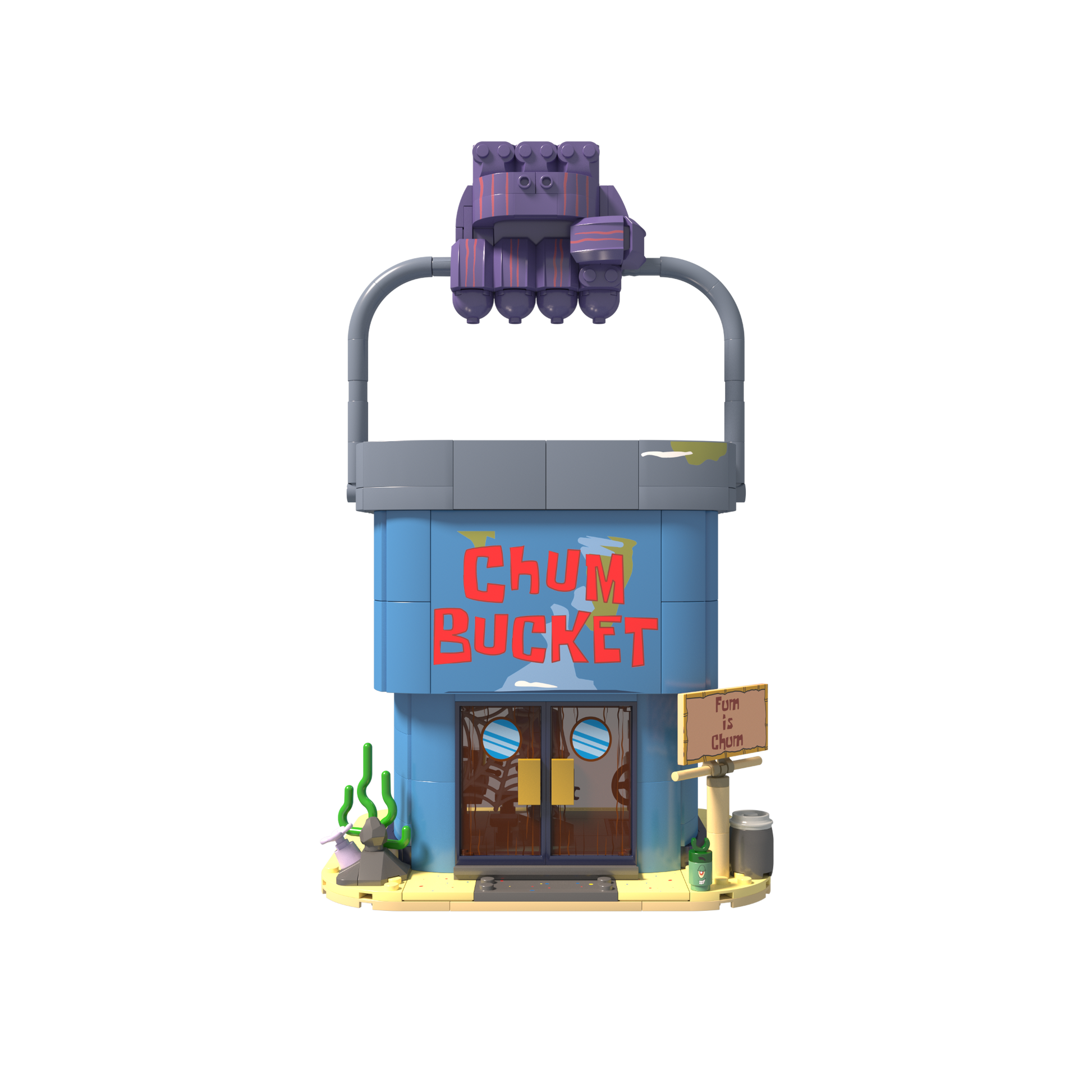 Step inside Bikini Bottom’s most notorious villain lair with Plankton’s Chum Bucket! This collector-grade build perfectly recreates the iconic bucket-and-hand design, complete with Plankton’s tiny house sign and coral details. Pull the massive handle backward, and the lid flips open to reveal a towering mechanical Plankton ready to launch another wild scheme against the Krusty Krab.