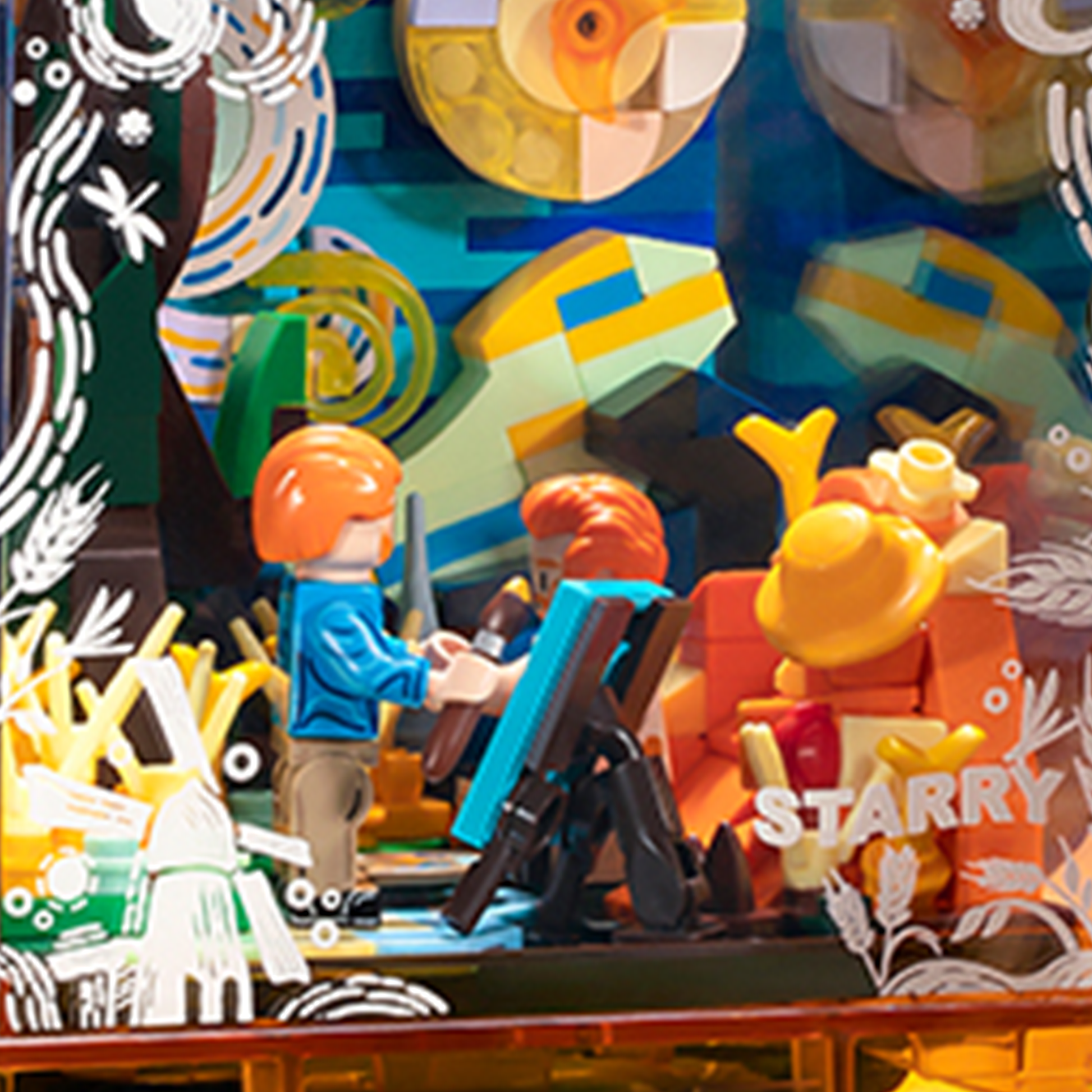• Background modeled after Van Gogh’s iconic The Starry Night, reconstructed with layered bricks and vivid movement