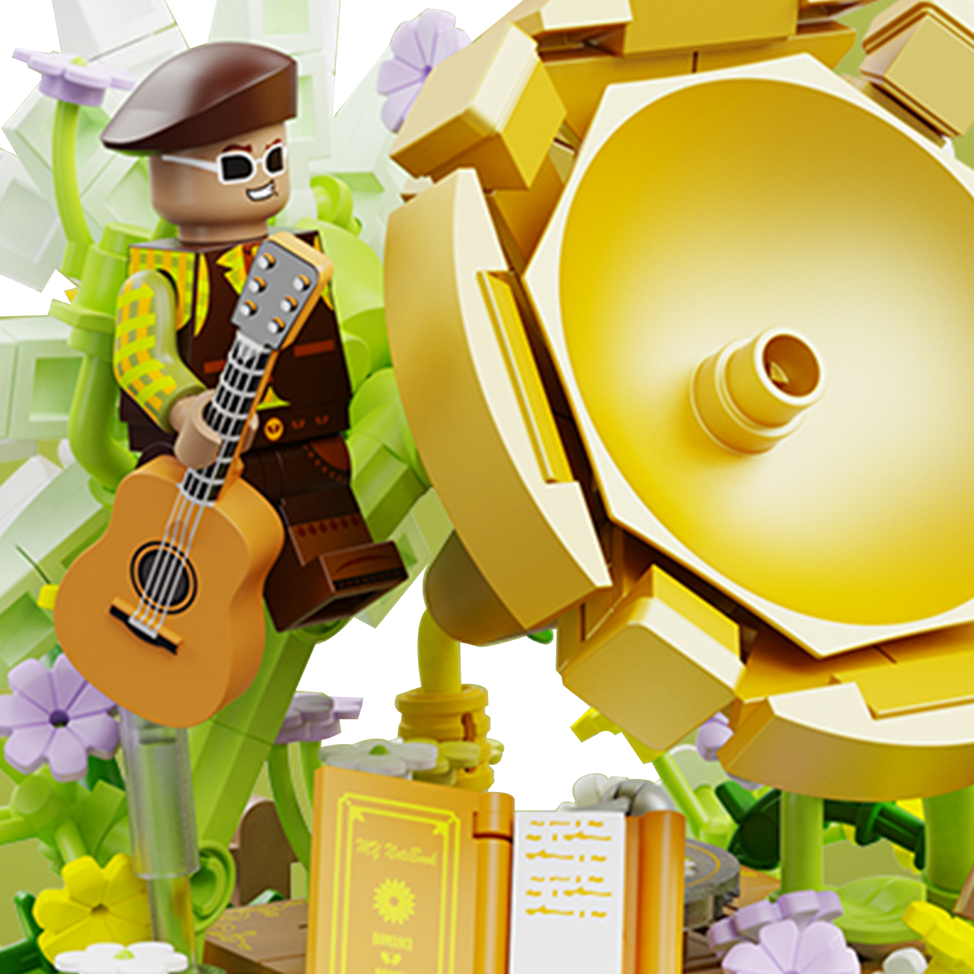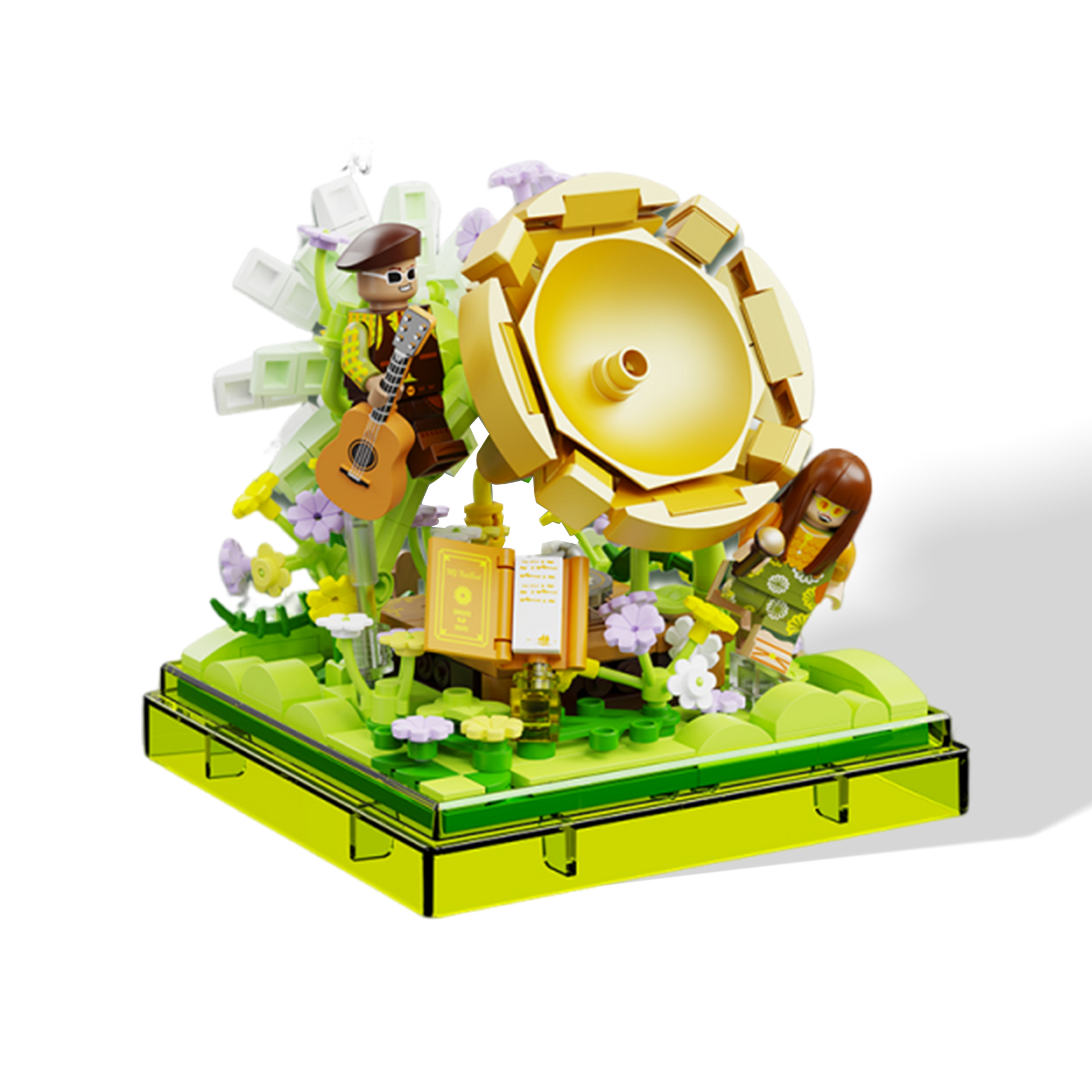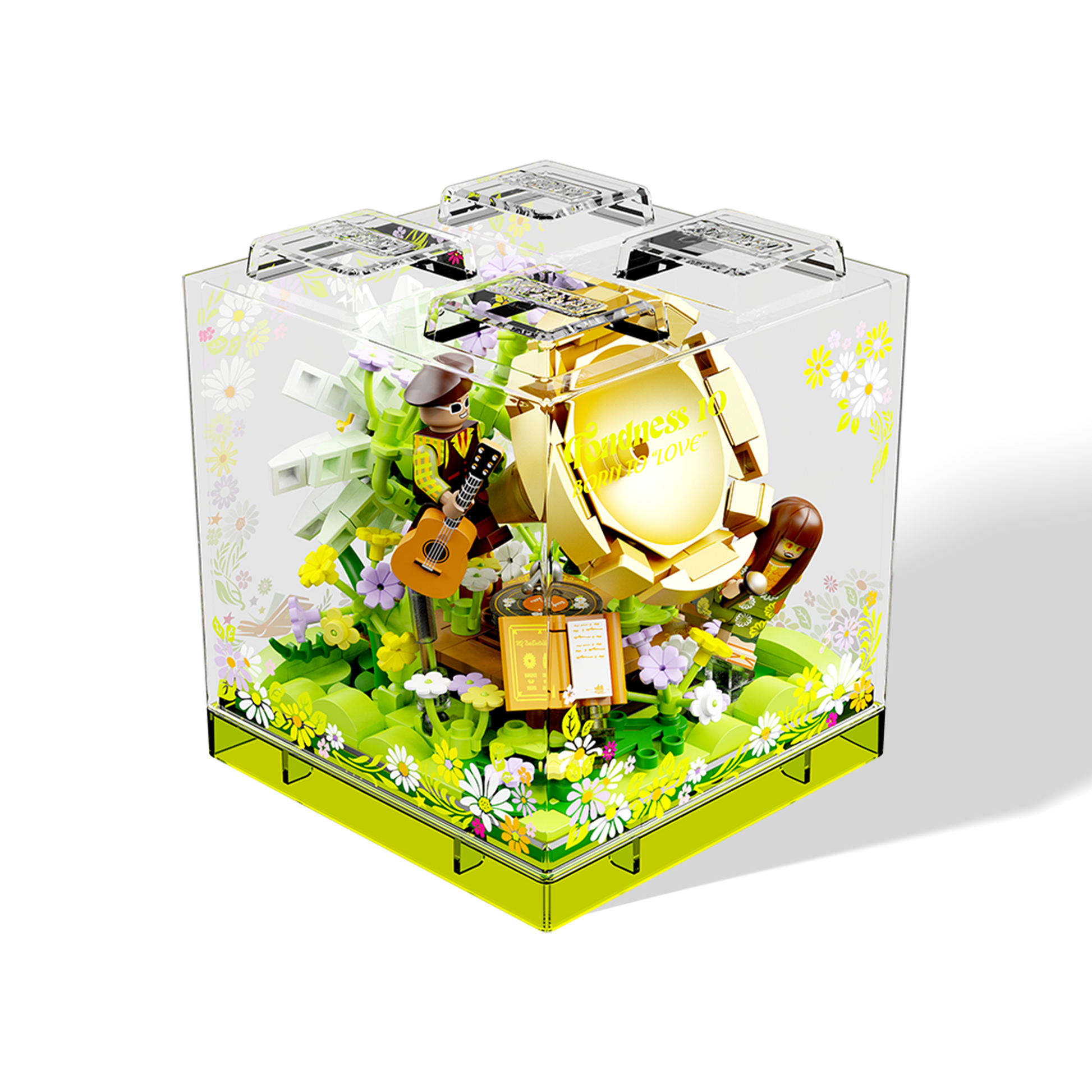 Hopeful and sun-drenched, Fondness paints the quiet optimism of young love. Set in a grassy glade blooming with African daisies, this brick vignette features a shining gold wristwatch centerpiece, a picnic setup, and heartfelt details like a love poem and guitar.